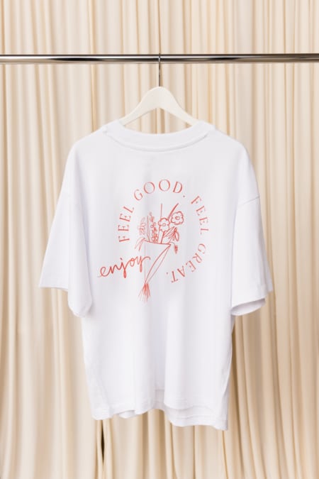 Unser weißes Unisex Oversize-Shirt aus 100 % Bio-Baumwolle mit feiner Stickerei und Backprint.